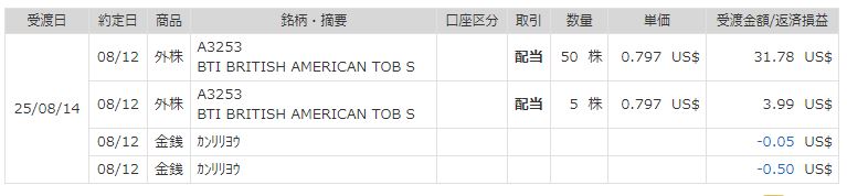 【2025年8月】ブリティッシュ・アメリカン・タバコから配当【BTI】