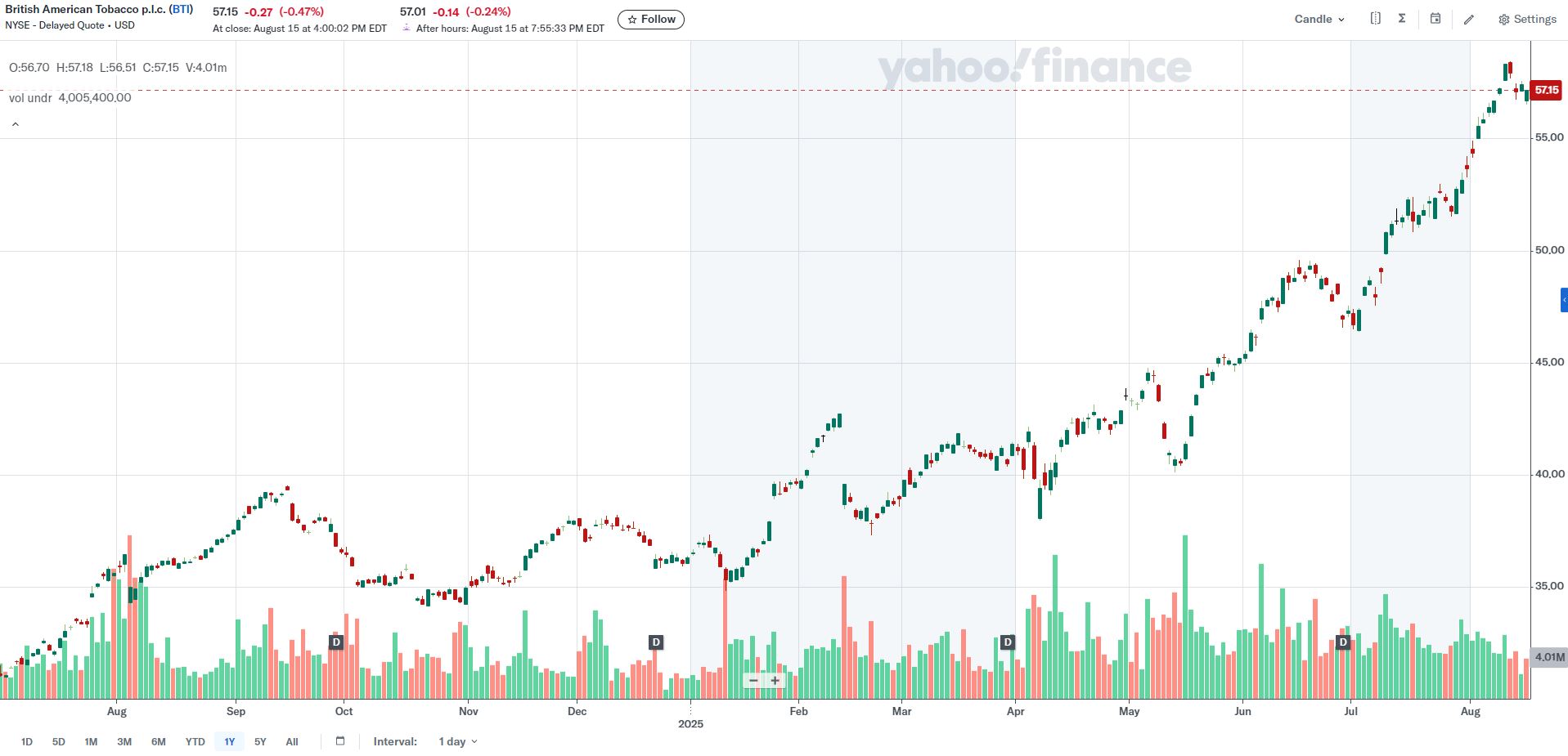 またVuse製品への19%関税には在庫前倒しで対応し、包装コスト上昇などの逆風も「管理可能」と説明。通期売上成長率は1~2%レンジの上限に到達する見通しで、米国市場の復調を軸にBTIは再び成長軌道へ回帰しつつあることを印象づけこれが好感され元々メンソール規制の撤廃で活気づいていた株価上昇の勢いを加速させるさらなる支援材料となり今回の大幅上昇と相成りました。