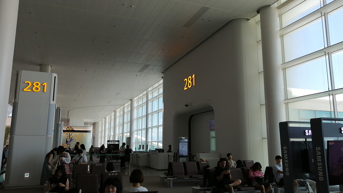 制限エリアに入ってから搭乗ゲートまでは異常に長く少なく見積もっても12~3分以上も歩かされた挙句ようやく281番ゲートに到着。